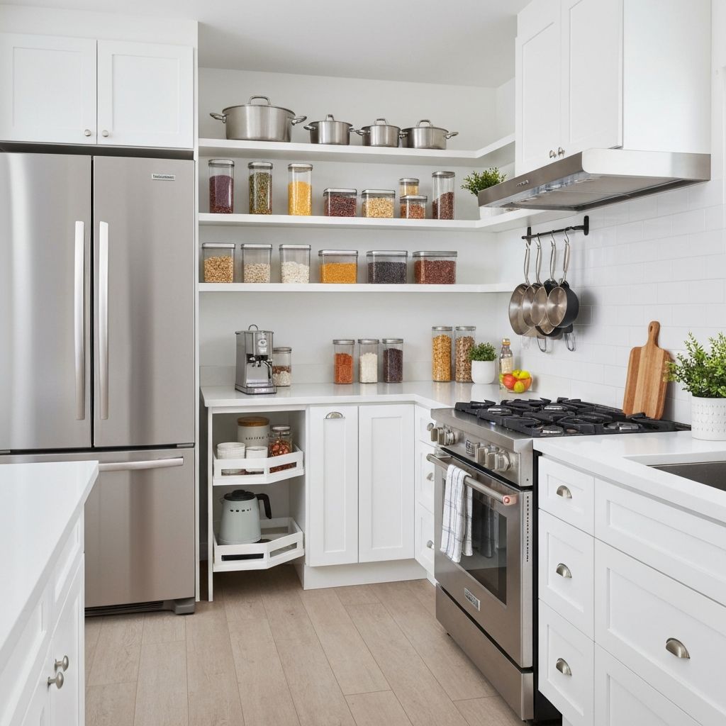 Floor-to-ceiling kitchen organization maximizing wall real estate.